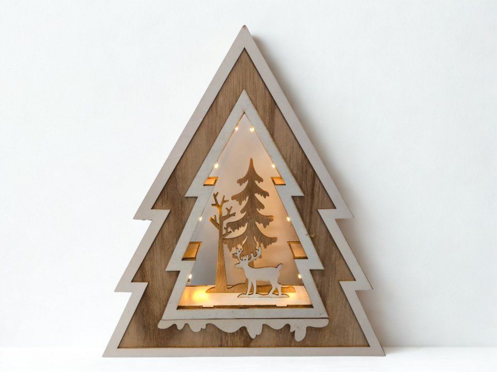 Elegantná vianočná dekorácia v tvare stromčeka z prírodného dreva s jemným LED osvetlením. Vnútri sa nachádza vyrezávaný motív soba a stromov, ktorý v kombinácii s teplým bielym svetlom vytvára útulnú a sviatočnú atmosféru. Vďaka jednoduchému prírodnému dizajnu sa hodí do moderných aj tradičných interiérov. Osvetlenie je napájané batériami, takže dekoráciu môžete umiestniť kamkoľvek bez potreby zásuvky.