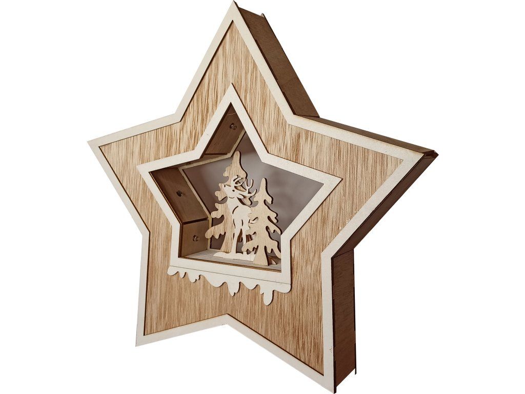 Drevená hviezdna vianočná dekorácia so sobom a stromčekmi, LED teplé svetlo