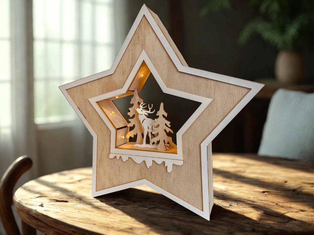 Masívna voľne stojaca drevená hviezda so sobom a lesom v pozadí. Táto nádherná dekorácia sa bude skvele vynímať na krbovej rímse, vo vašej chodbe, pod vianočným stromčekom alebo na parapete.