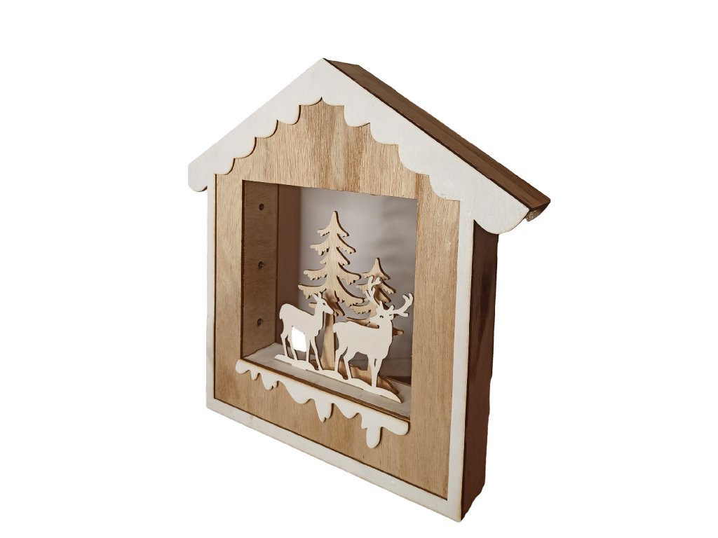 Vneste do svojho domova čarovnú vianočnú atmosféru s dreveným domčekom, v ktorom stojí sobia rodinka medzi zasneženými stromčekmi. Teplé biele svetlo LED diód krásne presvetľuje scénu a vytvára útulné sviatočné osvetlenie.