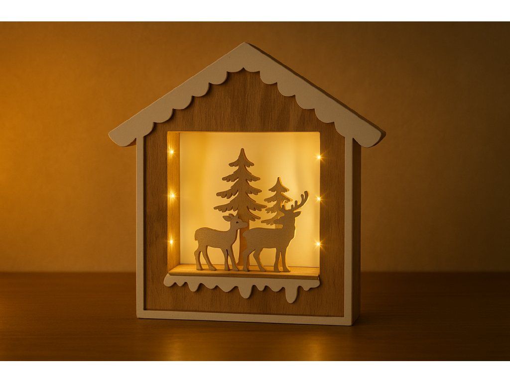 Vytvorte doma útulnú vianočnú atmosféru s elegantným dreveným domčekom, v ktorého strede stojí sobí rodina medzi zasneženými stromami. Teplé biele svetlo LED diód krásne presvetľuje scénu a dodáva jej rozprávkové čaro.