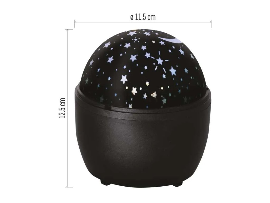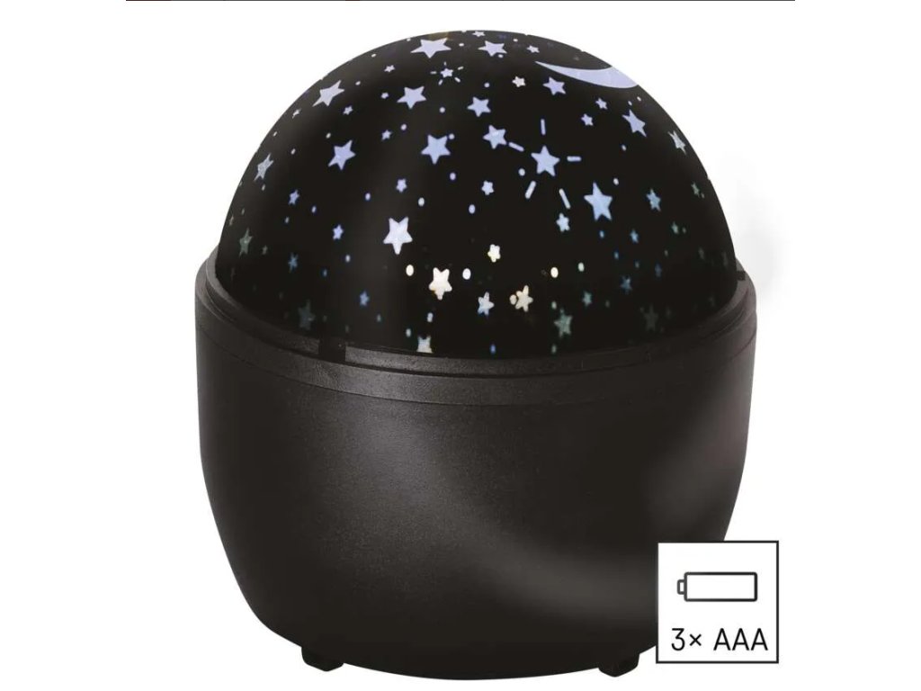 Projektor je možné napájať 3× AA batériami alebo USB adaptérom, takže jeho použitie je maximálne bezpečné, flexibilné a bez nutnosti riešiť prívodné káble. Rotujúci svetelný efekt dodáva hviezdičkám jemný pohyb pripomínajúci nočnú oblohu, ktorá deti upokojí a spríjemní im zaspávanie.