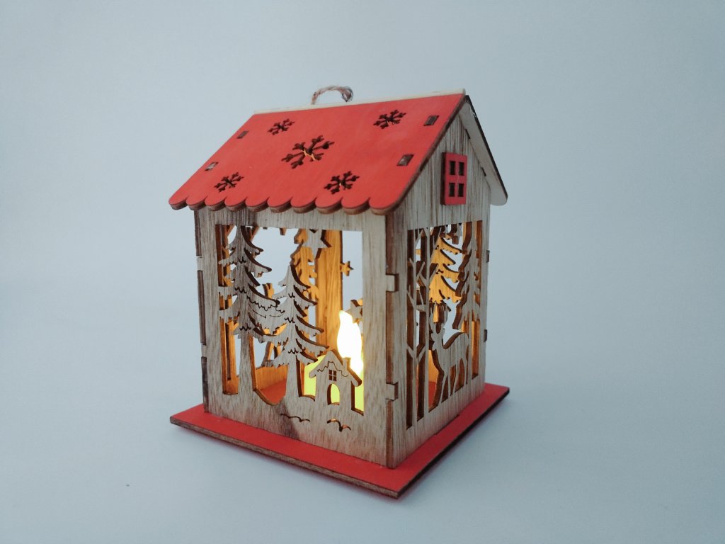 - Svetelná drevená dekorácia v tvare červeného domčeka so sobom a lesom, 10x10x12cm