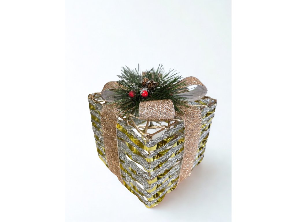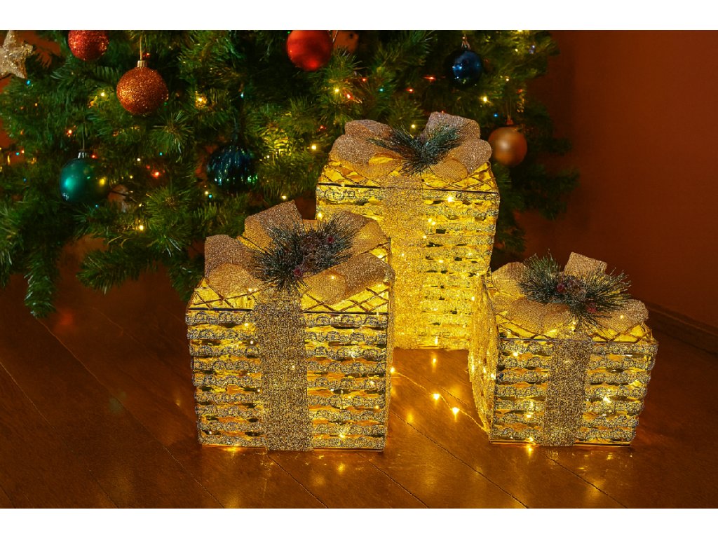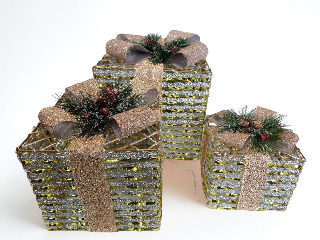 Vytvorte čarovnú vianočnú atmosféru s týmito elegantnými zlatými svietiacimi darčekovými krabicami. Sú vyrobené z odolného kovového rámu potiahnutého dekoratívnou trblietavou sieťovinou a ozdobené luxusnou mašľou, vetvičkou a bobuľami. Vnútorné LED svetielka jemne presvitajú cez štruktúru a vyžarujú teplé biele svetlo.