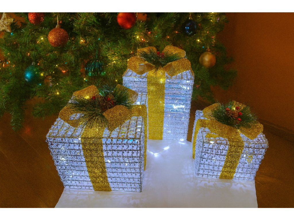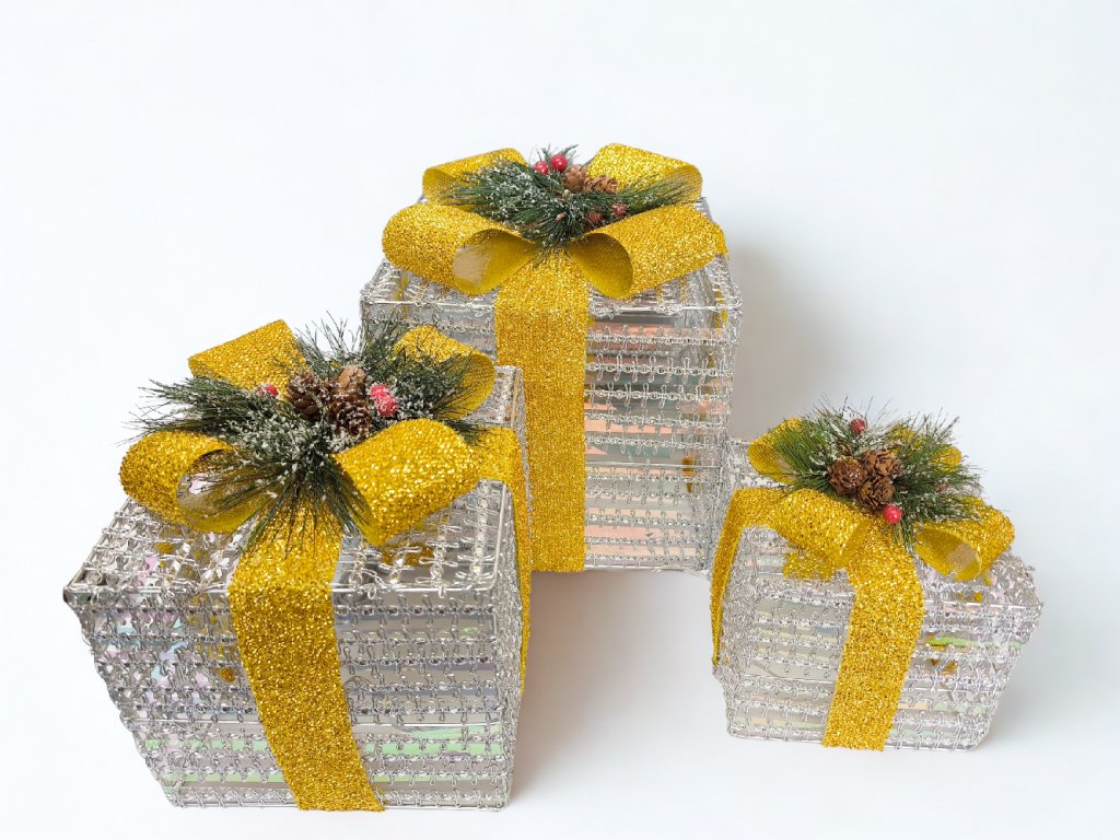 Elegantná sada LED vianočných darčekových boxov so studeným bielym svetlom vnesie do vášho domova slávnostnú a modernú atmosféru. Boxy sú vyrobené z pevnej kovovej drôtenej konštrukcie, do ktorej je vpletený LED reťaz. Povrch zdobí trblietavá zlatá stuha doplnená vetvičkami, bobuľkami a malými šiškami.