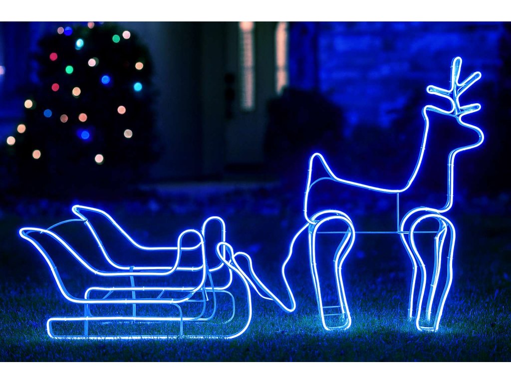 Vneste do svojej vianočnej výzdoby eleganciu a moderný štýl s dekoráciou soba so saňami, osvetlenou LED neon flex hadicou v modrej farbe. Vďaka tejto technológii pôsobí svetlo rovnomerne a vytvára krásne hladké línie, ktoré vyniknú na záhrade, terase aj v interiéri.