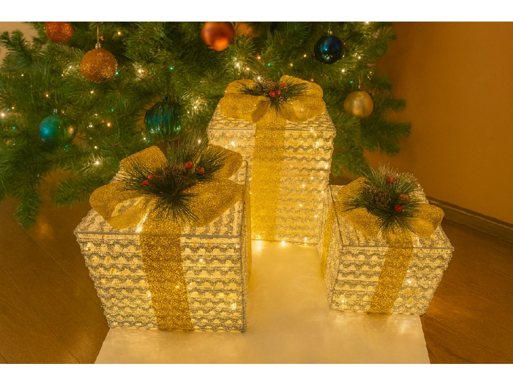 Elegantná sada 3 svietiacich vianočných darčekov v kombinácii striebornej konštrukcie a zlatej mašle vnesie do vášho domova slávnostnú atmosféru. Zabudované LED svetielka v teplej bielej farbe vytvárajú útulný a luxusný efekt.
