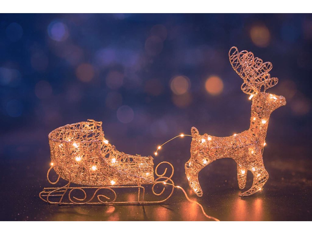 LED vianočný sob so saňami – ružovozlatá svietiaca dekorácia s trblietkami