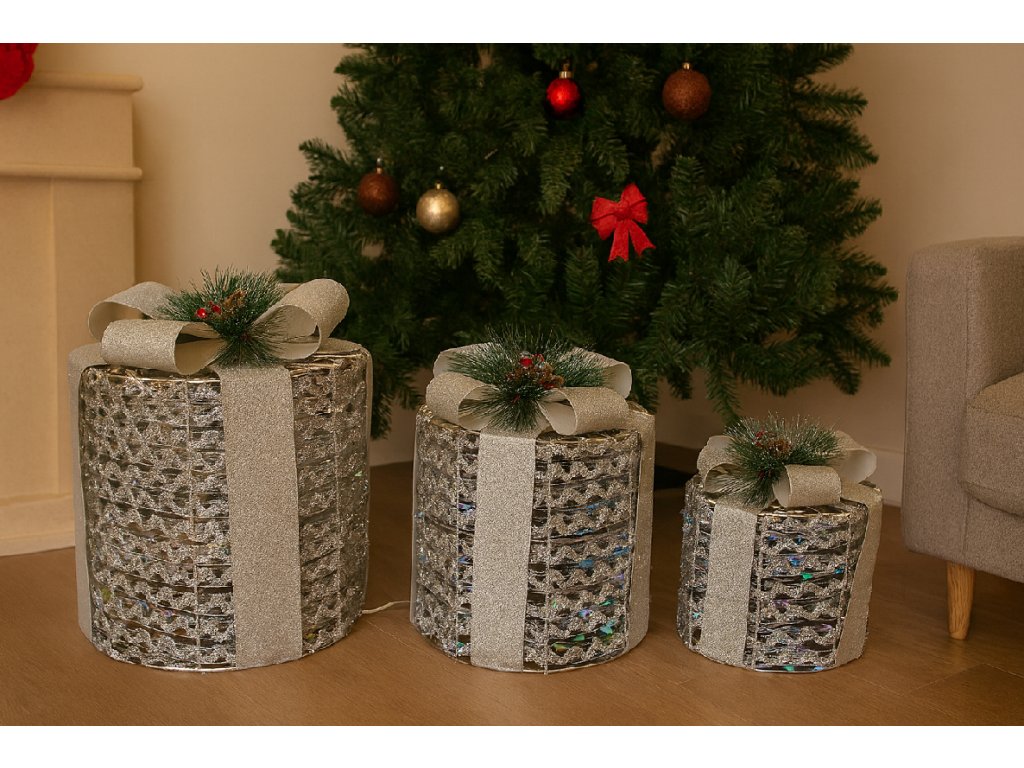 Elegantná sada troch vianočných darčekov v tvare valca s LED osvetlením v studenej bielej farbe vytvorí útulnú a slávnostnú atmosféru. Strieborný povrch s jemnou sieťovinou, ozdobnou mašľou a vianočnou dekoráciou pôsobí luxusne a rozžiari každý interiér. Vďaka trom rôznym veľkostiam ich môžete postaviť spolu ako sadu alebo rozmiestniť samostatne. Skvele sa hodia pod vianočný stromček, do obývačky, vstupnej haly alebo výkladu.