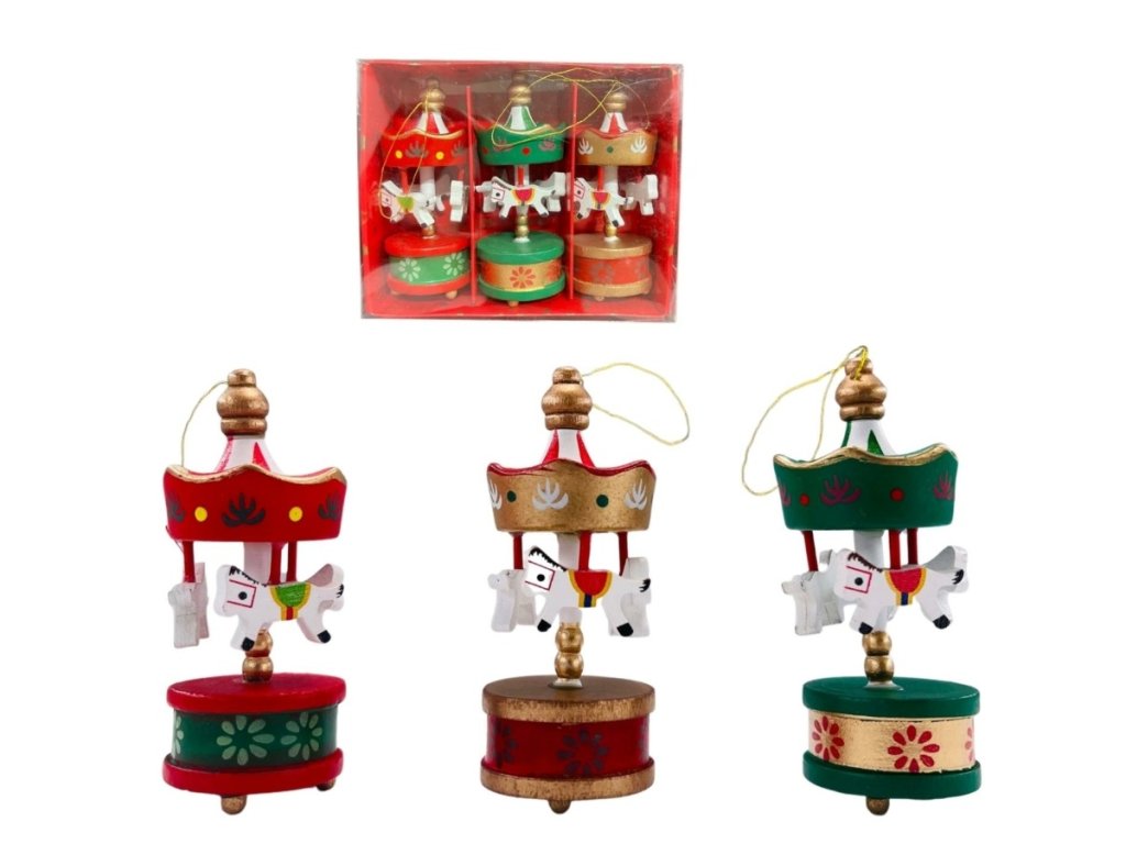 Sada drevených ozdôb na stromček, Kolotoč s koníkmi, 3ks, 2,8x8cm