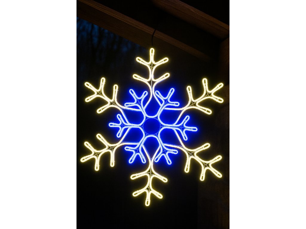 Elegantná svietiaca dekorácia v tvare snehovej vločky s priemerom 70 cm sa stane neprehliadnuteľným prvkom vašej vianočnej výzdoby. Kombinácia studenej bielej a modrej farby vytvára nádherný kontrast a navodzuje pravú zimnú atmosféru.