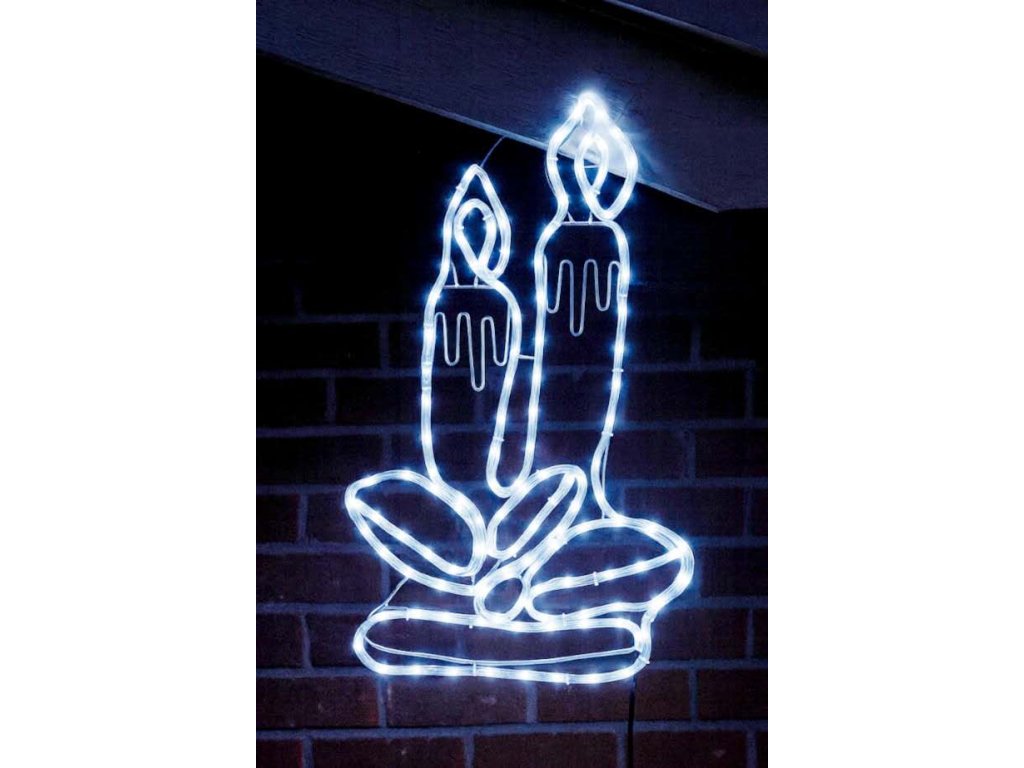 Táto vianočná dekorácia v tvare dvoch sviečok je vyrobená z LED hadice upevnenej na pevnej kovovej konštrukcii, čo zaručuje stabilitu a dlhú životnosť. Jasné biele svetlo vytvára príjemnú a slávnostnú atmosféru, ideálnu na ozdobenie strechy, fasády, balkóna alebo okien. Vďaka jednoduchému, ale elegantnému dizajnu sa dokonale hodí k akejkoľvek vianočnej výzdobe.