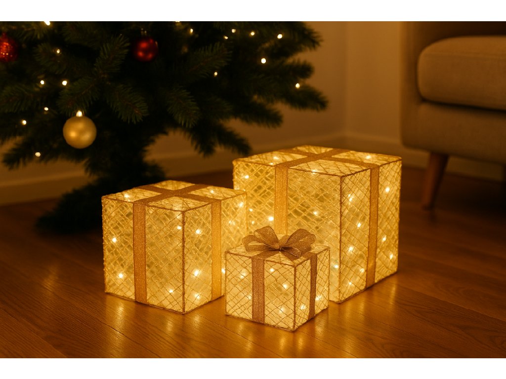 Svietiace LED dekorácie - darčeky s ozdobou, zlatá stuha, 3 veľkosti, studená biela