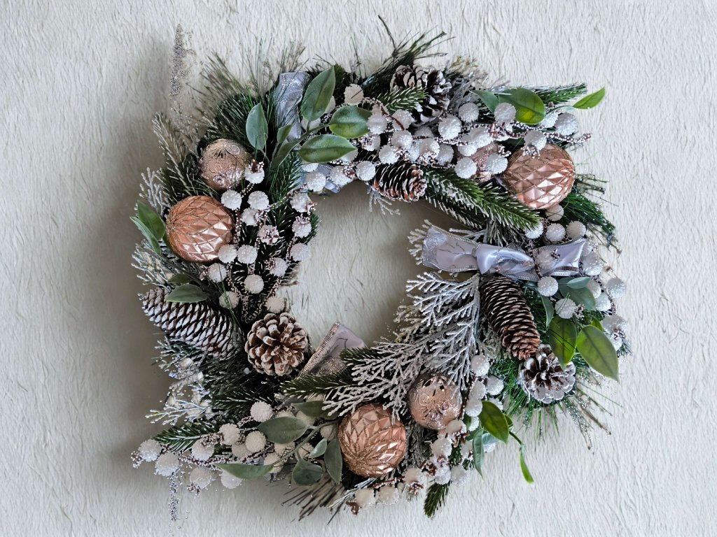 Štýlový vianočný veniec s priemerom 40 cm v modernej farebnej kombinácii vnesie do vášho domova nádych elegancie a luxusu. Základ tvorí husté zelené vetvičky so zasneženým efektom, doplnené prírodnými šiškami, ozdobnými bielymi bobuľkami a guľami v odtieňoch ružového zlata. Výrazné detaily v podobe strieborných mašlí a zelených lístkov dodávajú vencu svieži a originálny vzhľad.