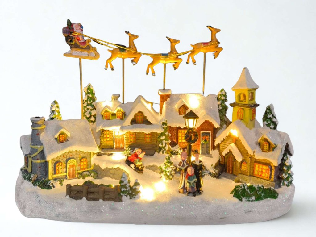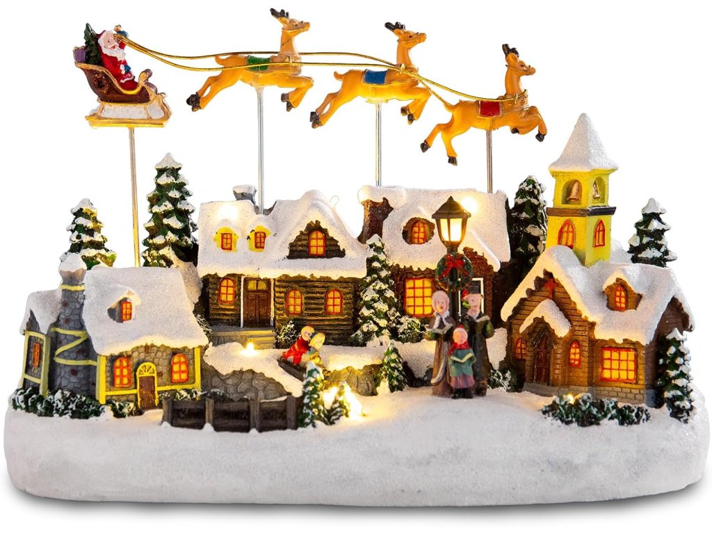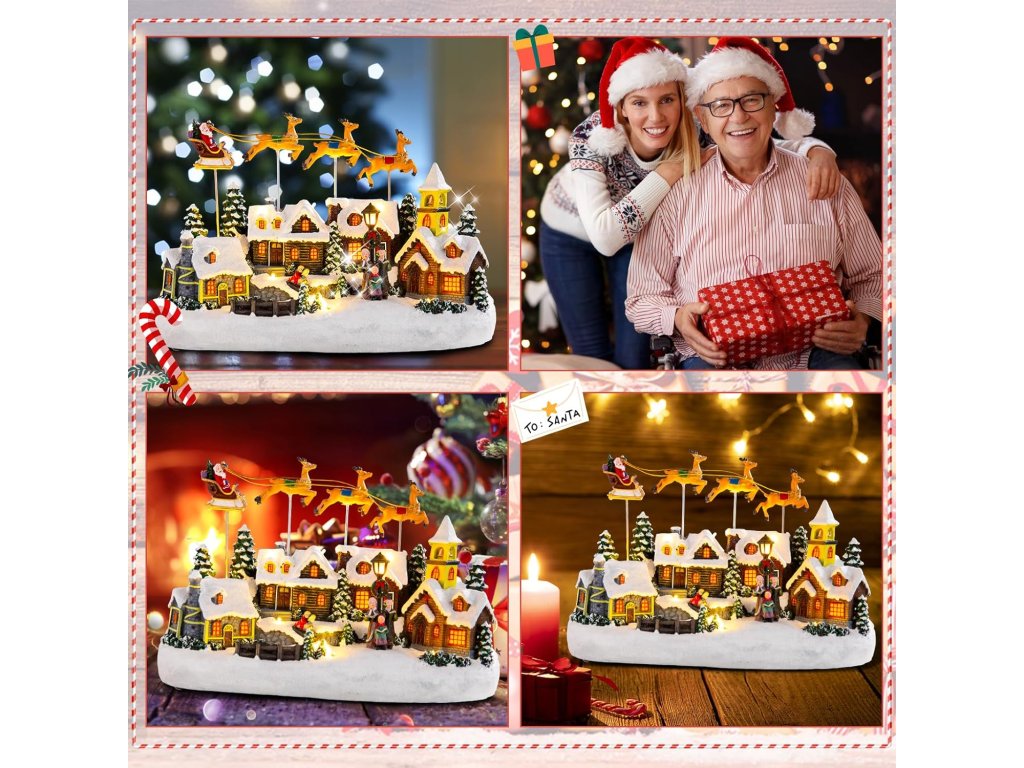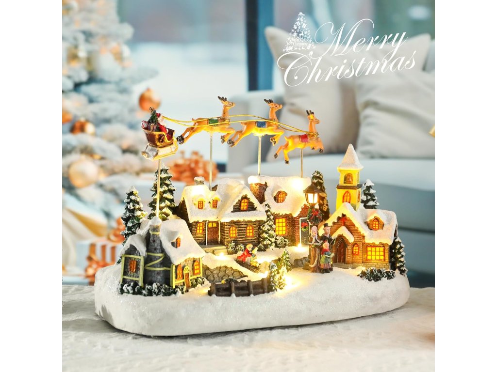 Vytvorte si doma čarovnú vianočnú atmosféru s touto nádhernou vianočnou dedinkou so Santom a jeho sobmi. Detailne prepracovaná dekorácia zachytáva zasneženú zimnú scénu s osvetlenými domčekmi, lampou, vianočným stromčekom a spievajúcimi postavičkami. Nad dedinkou letí Santa Claus vo svojom saniach ťahaných soby – a tí sa skutočne pohybujú, čo celej scéne dodáva živosť a kúzlo Vianoc.