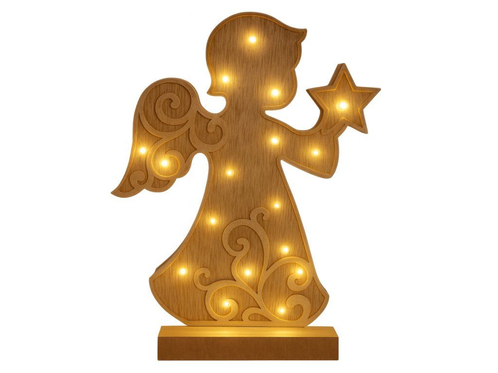 Krásny drevený doplnok s 18 LED diódami. Rozžiari váš domov i srdce a navodí tú pravú atmosféru vianočného pokoja. Motív: LED dekoračná ozdoba, drevený anjel. Bezdrôtová prevádzka, možno položiť kamkoľvek.