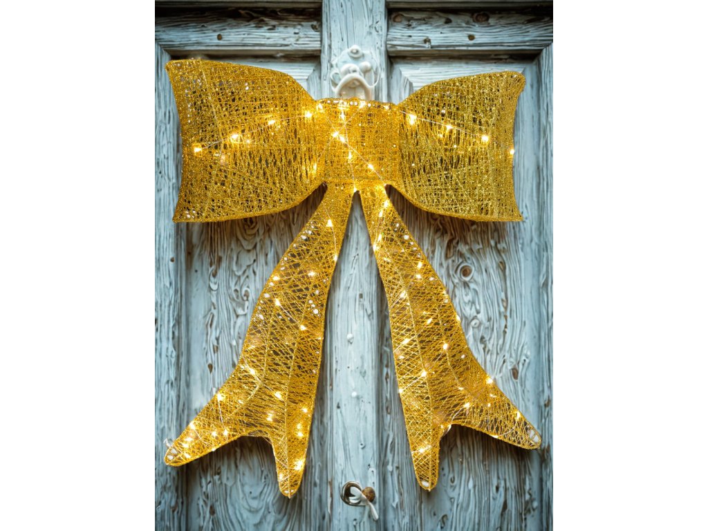 Vianočná LED dekorácia – Zlatá trblietavá mašľa s teplým bielym svetlom