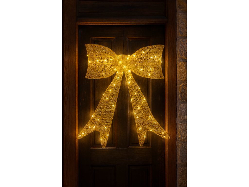Elegantná vianočná LED dekorácia v tvare zlatej trblietavej mašle rozžiari váš domov teplým bielym svetlom. Vďaka svojej veľkosti sa stane neprehliadnuteľným prvkom vianočnej výzdoby na dverách, okne alebo stene. Kvalitné prevedenie so zlatými trblietkami dodáva dekorácii luxusný a slávnostný vzhľad, zatiaľ čo LED technológia zaručuje nízku spotrebu energie a dlhú životnosť. Ideálna pre vnútorné aj kryté vonkajšie použitie – vytvorte si útulnú a elegantnú vianočnú atmosféru bez námahy.