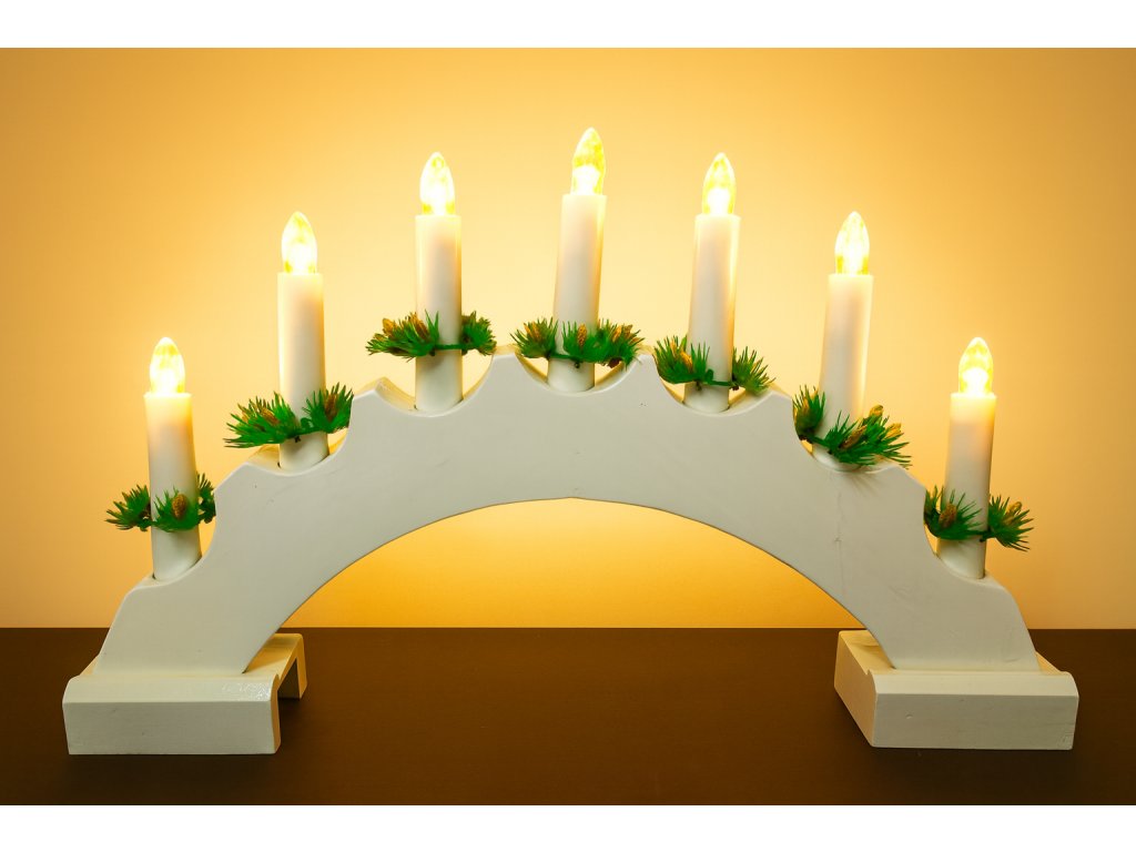 Vianočný drevený svietnik v tvare oblúka, biela, 7 sviečok, teplá biela, na batérie