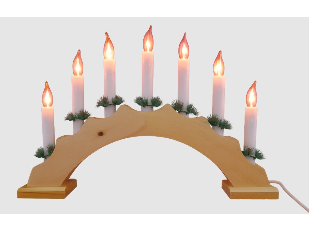 Vianočný drevený svietnik v tvare oblúka, prírodná farba, 7 sviečok plameň