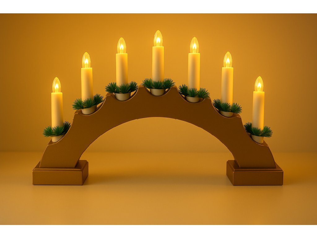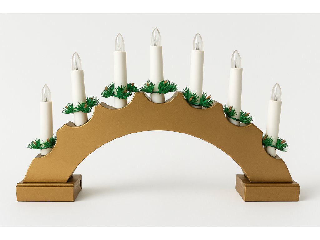 Vianočný drevený svietnik v tvare oblúka, zlatá farba, 7 sviečok, teplá biela, na batérie
