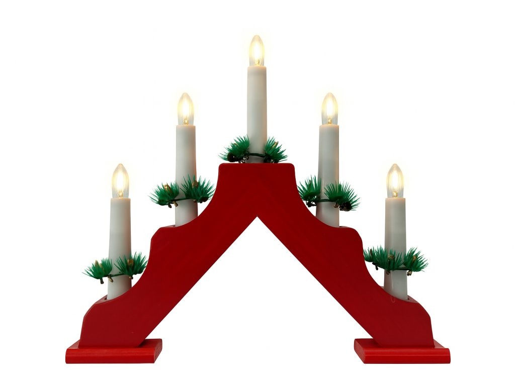 Vianočný drevený svietnik v tvare pyramídy, červená, 5 sviečok, teplá biela,