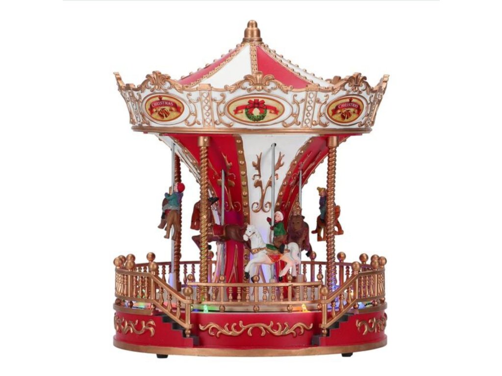 Na kolotoči sa striedajú farebné figúrky detí a zvierat, koníky s pozlátenými sedlami a elegantné zábradlie s ornamentmi – to všetko v tradičnom červeno-zlatom dizajne pripomínajúcom čarovné trhy a vianočnú nostalgiu.