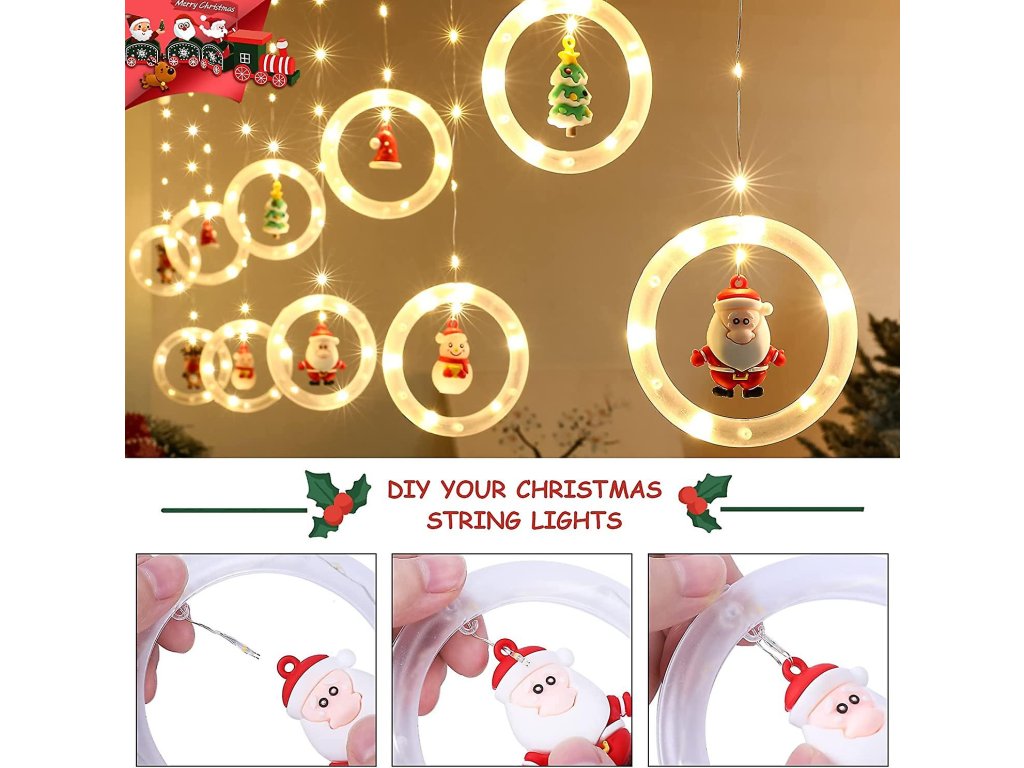 Vianočný LED svetelný záves s 10 krúžkami (10 cm) a postavičkami prináša kúzlo sviatkov. S 100 LED na 3 metroch, rozdelených do 10 prameňov, striedajúcich kratšie (47 cm) a dlhšie (70 cm) s rozostupmi 30 cm, vytvára očarujúce efekt. Motívy ako Santa Claus, stromček, snehuliak, sob a čiapočka sú individuálne navliekané na krúžky, čo umožňuje kreatívne aranžovanie. Ideálne na pridanie vianočnej nálady do vášho priestoru.