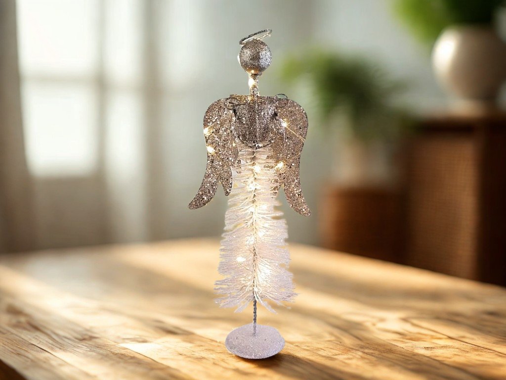 Tento vianočný svietiaci kovový anjel s harfou prináša do vášho domova žiarivú atmosféru. Svieti teplou bielou farbou a ponúka možnosť trvalého svietenia alebo režimu 6 hodín zapnuté / 18 hodín vypnuté. Napájanie je zabezpečené batériami. Tento celokovový anjel má křídla a trblietavý efekt, ktorý dodáva vianočnému priestoru kúzelný vzhľad.