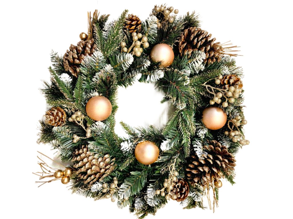 - Motív: vianočný veniec s prírodnými šiškami a zlatou dekoráciou
