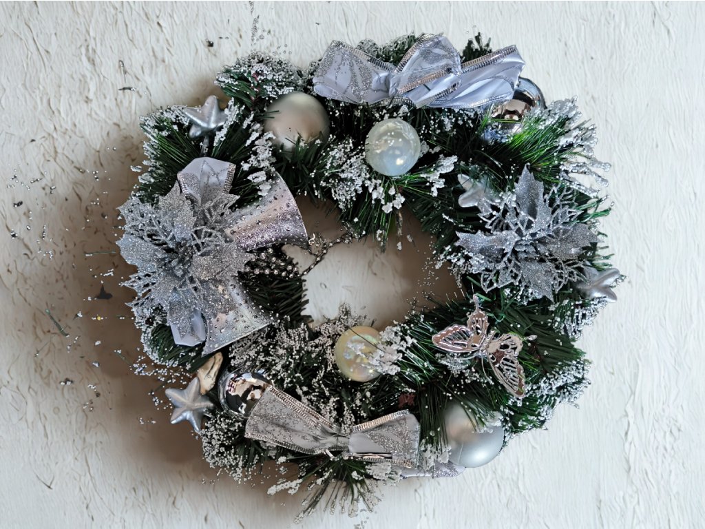 Luxusný vianočný veniec s priemerom 30 cm vnesie do vášho domova modernú eleganciu a slávnostné kúzlo. Husté zelené vetvičky sú pokryté efektom umelého snehu a bohato zdobené striebornými guľami, mašľami, zvončekmi, trblietavými kvetmi a ozdobnými hviezdami. Nechýbajú ani jemné detaily, ako motýlik, ktoré dodávajú vencu originálny charakter.