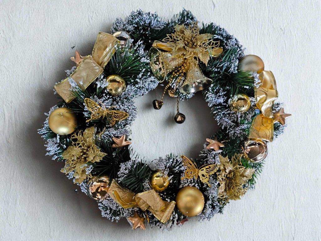 - Motív: vianočný veniec so zlatou dekoráciou