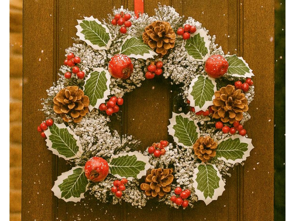 - Motív: vianočný veniec s cezmínou a prírodnými dekoráciami