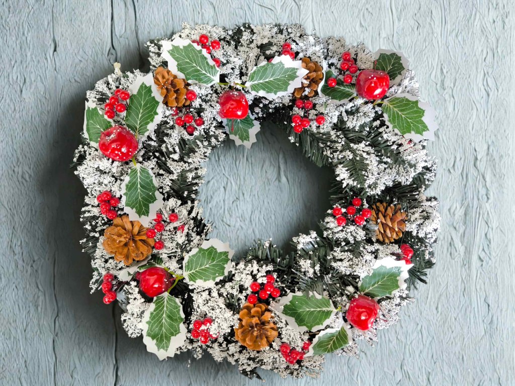 - Motív: vianočný veniec s cezmínou a prírodnými dekoráciami