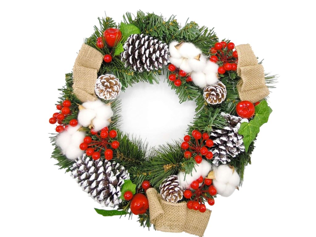 Vianočný veniec so šiškami, červenými bobuľami, bavlnou a mašľou, 40cm