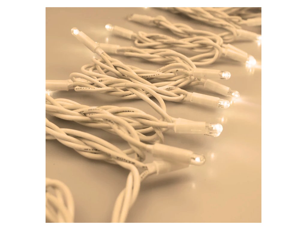 Vnútorná LED vianočná reťaz - teplá biela, 10m, 100 LED, hrubý biely kábel