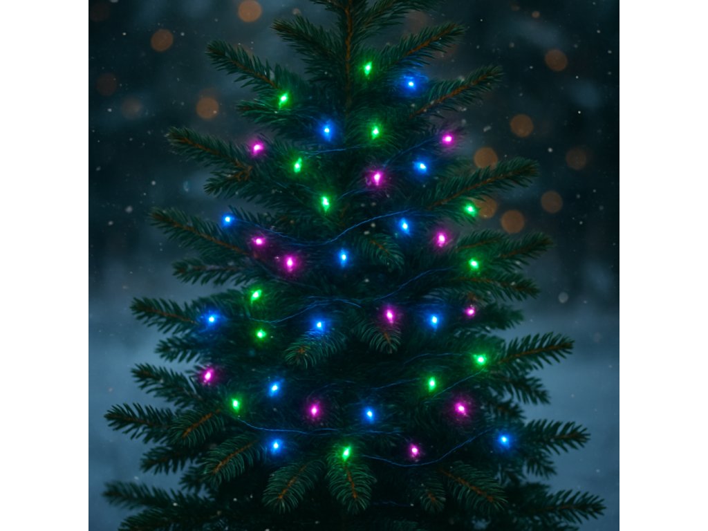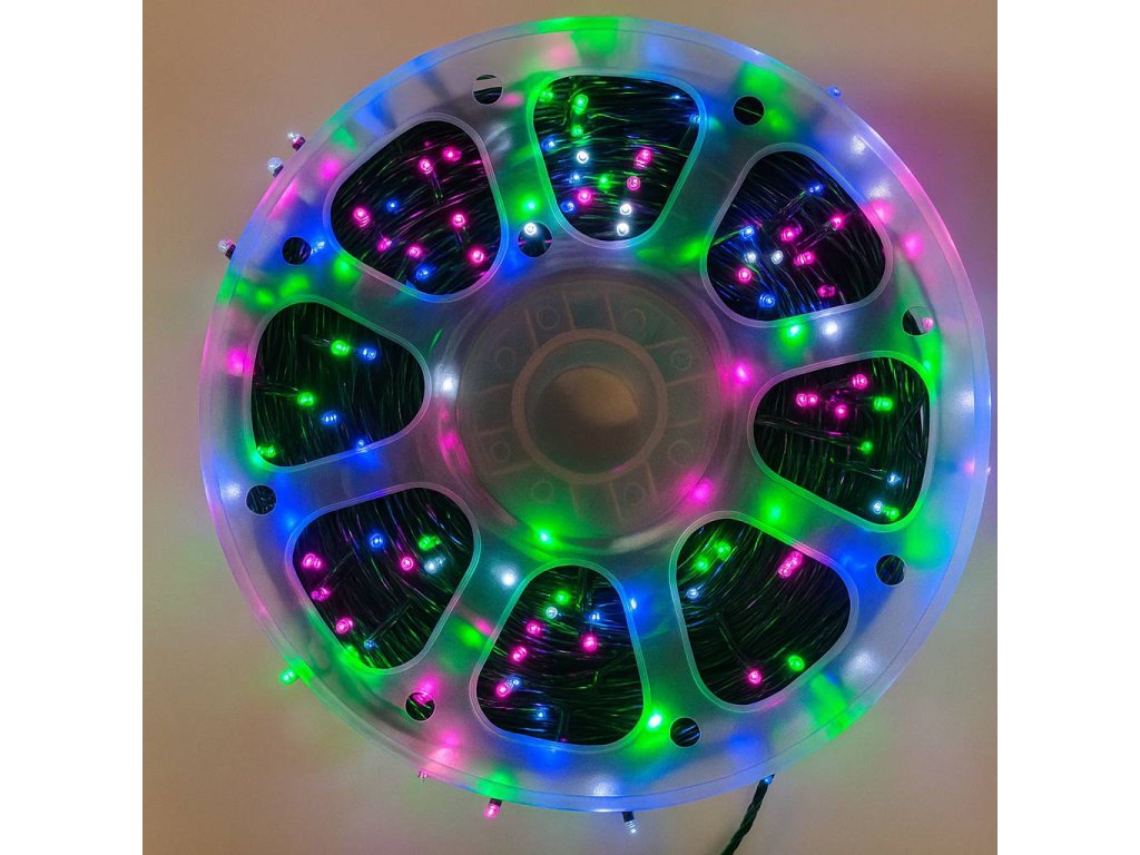 Vytvorte čarovnú sviatočnú atmosféru s týmto 100 m dlhým LED reťazcom s 1000 rôznofarebnými diódami. Vďaka diaľkovému ovládaču môžete jednoducho prepínať medzi 8 svetelnými programami a nastaviť časovač na 2 h, 4 h, 6 h alebo 8 h prevádzky. Zelený kábel dokonale splynie s prostredím, a preto sa hodí na fasády, terasy aj stromčeky.