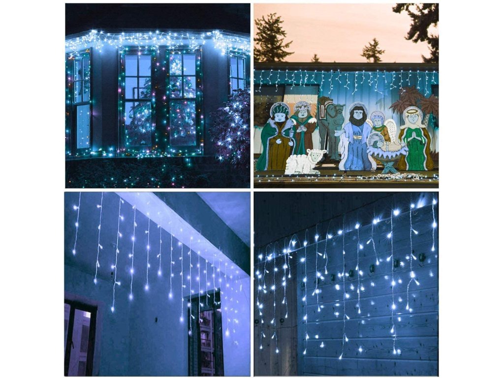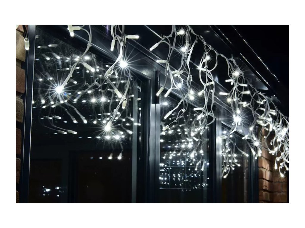 Profesionálny vonkajší LED vianočný záves s dĺžkou 10 metrov a 312 silnými 7mm LED diódami v teplej bielej farbe vytvára elegantný zimný efekt ideálny na výzdobu domov, striech, pergol aj komerčných priestorov. Záves je určený pre stále svietenie a ponúka prepojiteľný profesionálny systém, ktorý umožňuje jednoduché napojenie ďalších svetelných reťazí alebo dekorácií. Vďaka prepleteným 8mm reťazcom, prívodnému káblu s dĺžkou 1,5 m (5 mm priemer) a krytiu IP44 je osvetlenie vysoko odolné voči poveternostným vplyvom. Biely napájací kábel dodáva svetelnému závesu čistý, estetický vzhľad.