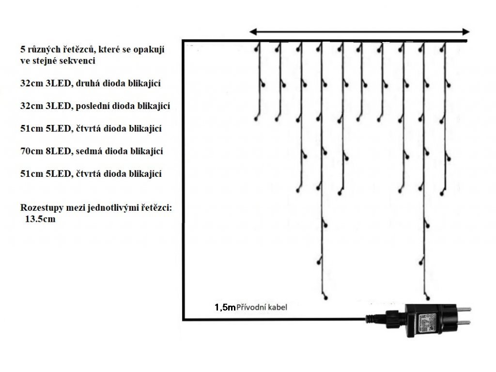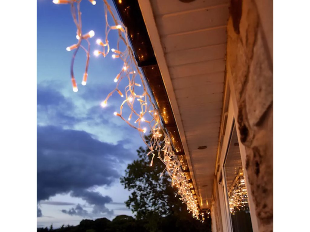 Profesionálny vonkajší LED vianočný záves s dĺžkou 10 metrov a 312 silnými 7mm LED diódami v studenej bielej farbe vytvára elegantný zimný efekt ideálny na výzdobu domov, striech, pergol i komerčných priestorov. Záves je určený pre stále svietenie a ponúka prepojiteľný profesionálny systém, ktorý umožňuje jednoduché napojenie ďalších svetelných reťazí alebo dekorácií. Vďaka prepleteným 8mm reťazcom, prívodnému káblu s dĺžkou 1,5 m (5 mm priemer) a krytiu IP44 je osvetlenie vysoko odolné voči poveternostným vplyvom. Biely napájací kábel dodáva svetelnému závesu čistý, estetický vzhľad.